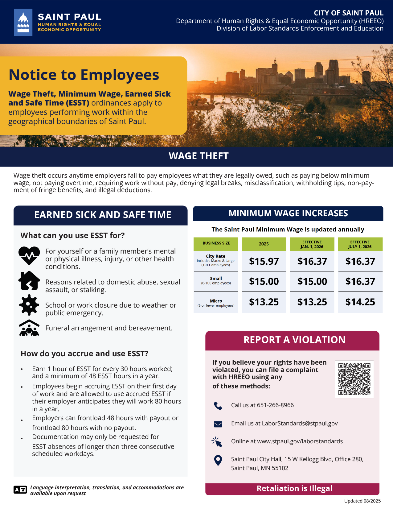 Minnesota - St Paul City Ordinances Poster (Minimum Wage, Earned Sick and Safe Time, Wage Theft)