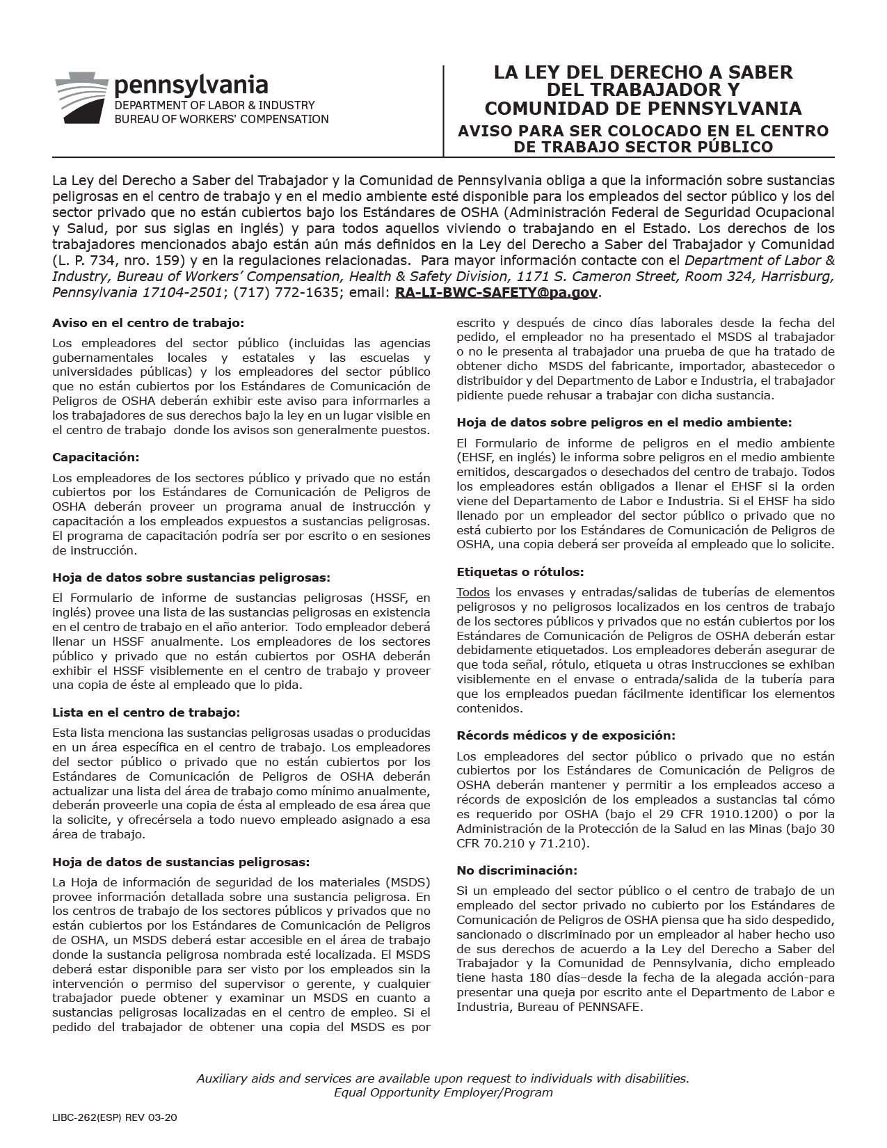 Pennsylvania Right to Know Act Poster Spanish