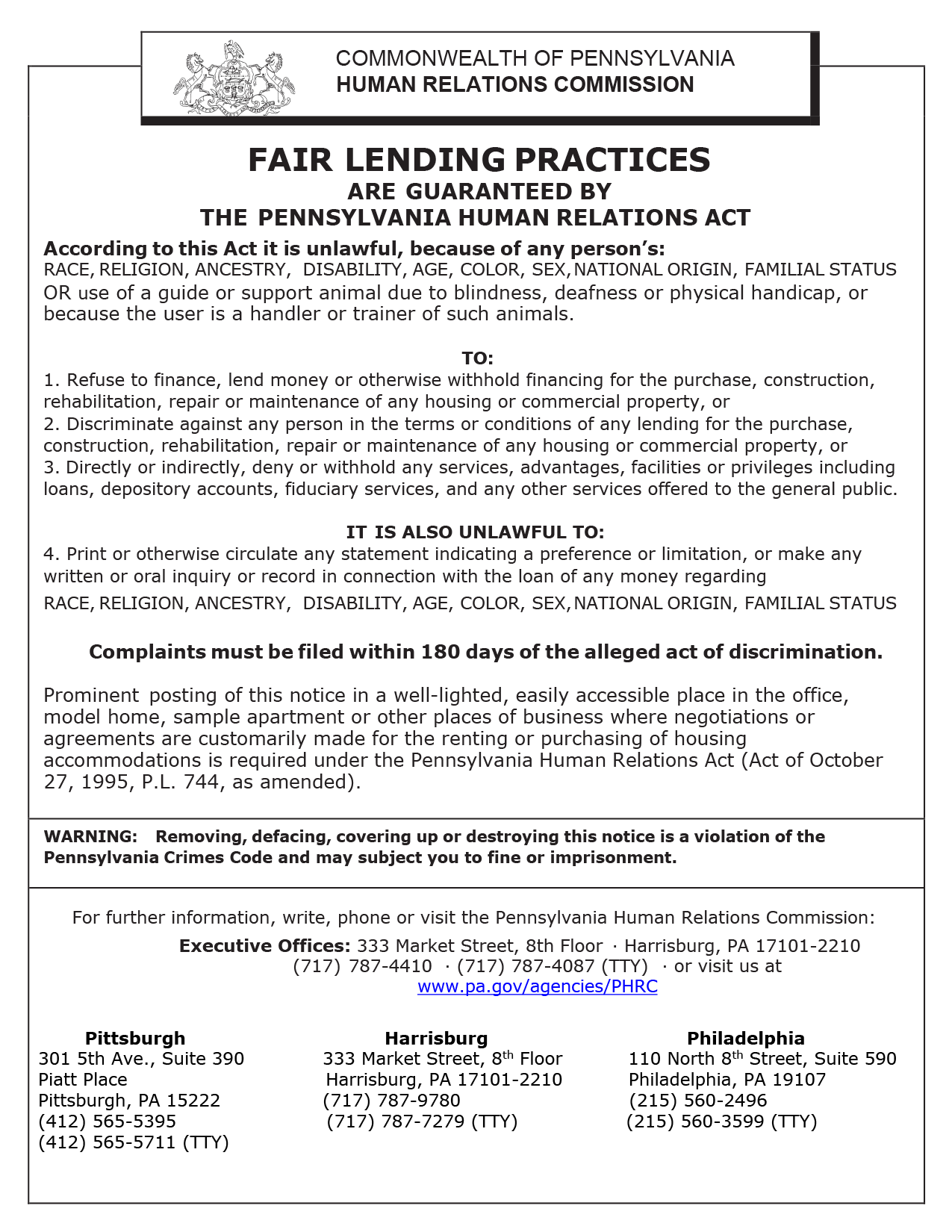 Pennsylvania Fair Lending Practices Poster