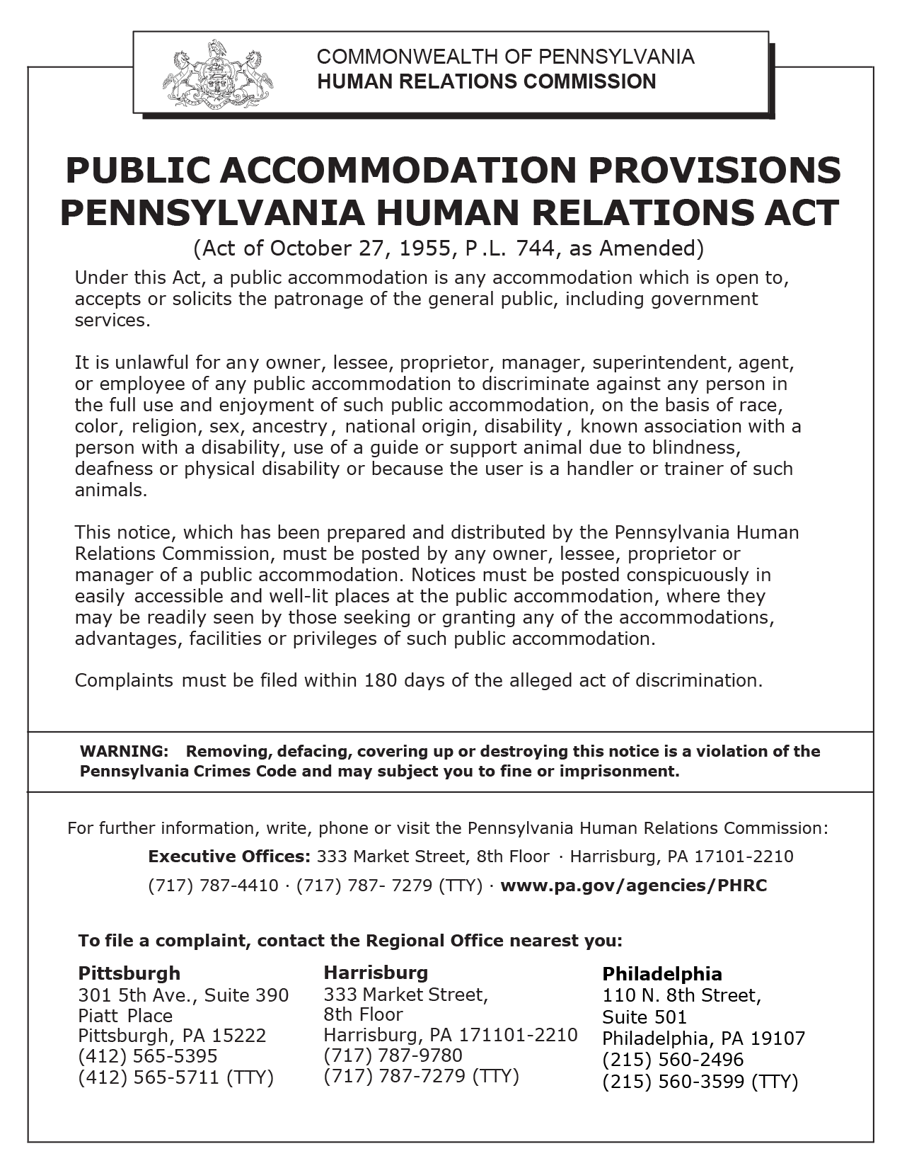Pennsylvania Public Accommodation Provisions Poster